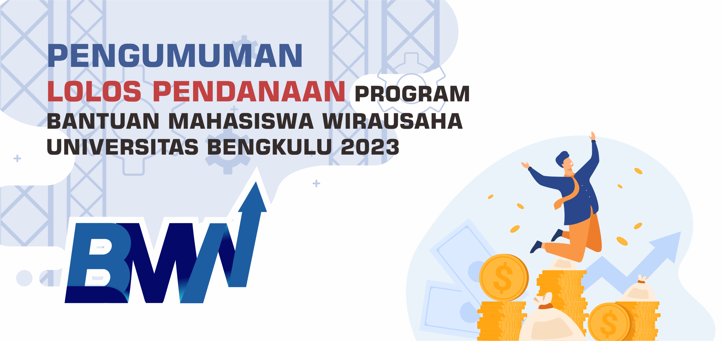 Berdasarkan hasil seleksi Program Bantuan Mahasiswa Wirausaha (BMW) Universitas Bengkulu tahun 2023 yang meliputi seleksi substansi, seleksi pemaparan, dan survey lokasi, bersama ini kami kirimkan daftar pengusu; BMW tahun 2023 yang dinyatakan lolos seleksi dan berhak menerima pendanaan BMW tahun 2023.