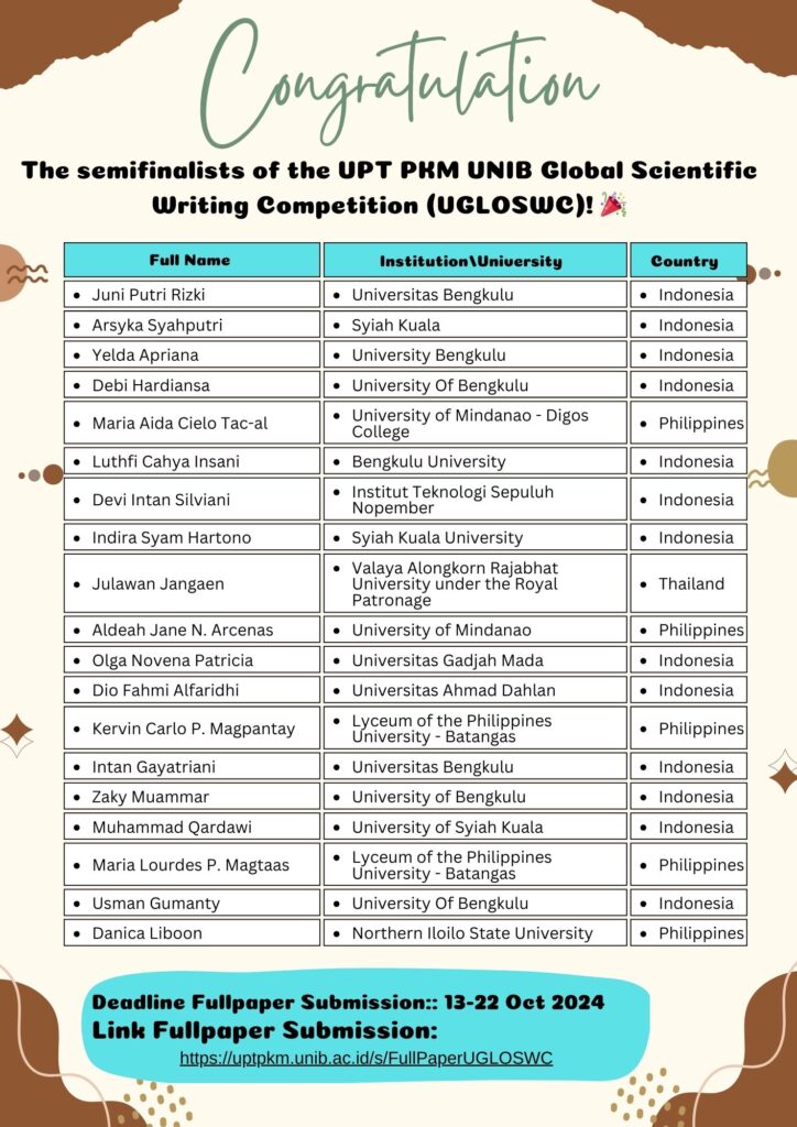 Congratulations to the semifinalists of the UPT PKM UNIB Global Scientific Writing Competition (UGLOSWC)! 🎉