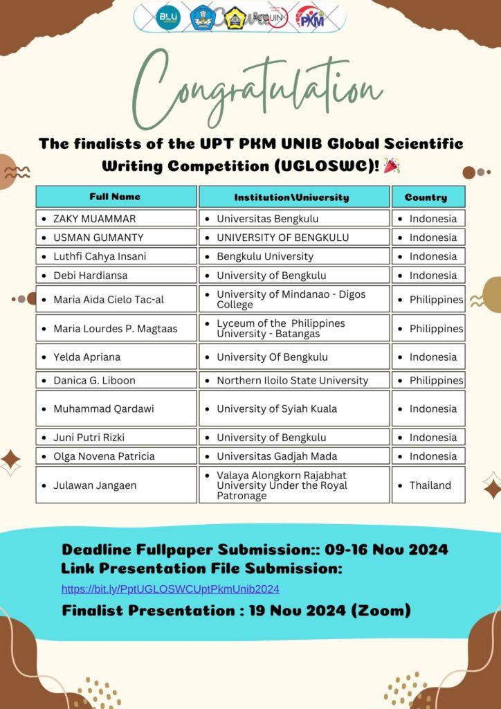 Congratulations to all finalists of the “UPT PKM UNIB Global Scientific Writing Competition (UGLOSWC) 2024”! We celebrate your hard work and dedication in this competition, and we look forward to seeing your continued success.